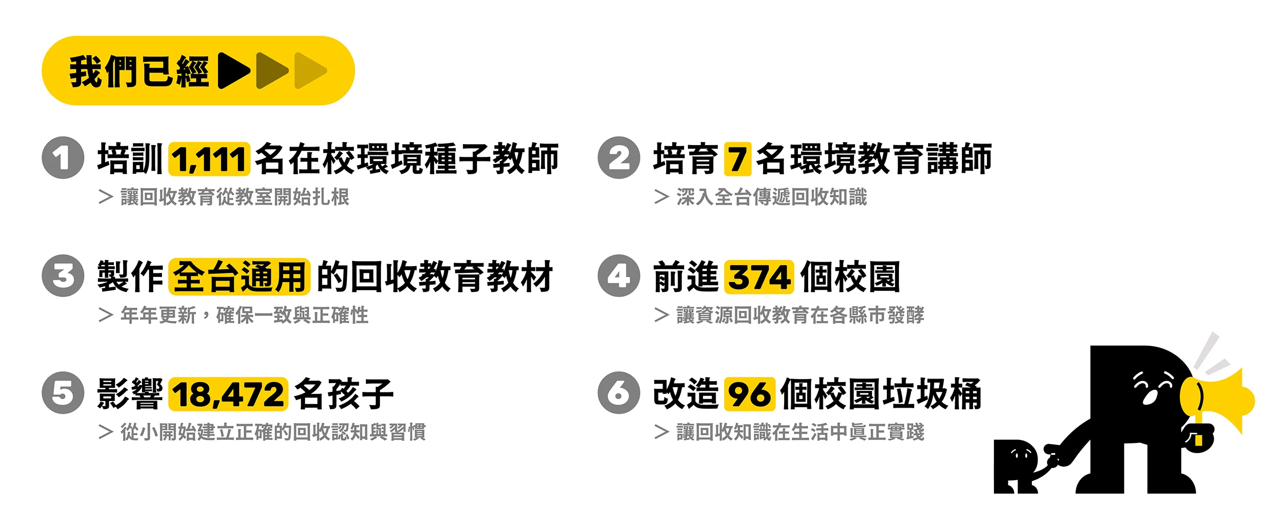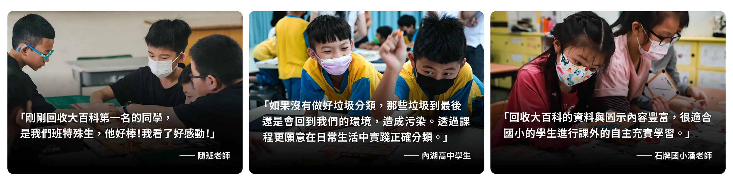 培育環境教育講師,深入全台校園:以《回收大百科》課程將正確回收知識帶入教室,讓學生從小建立環境素養。