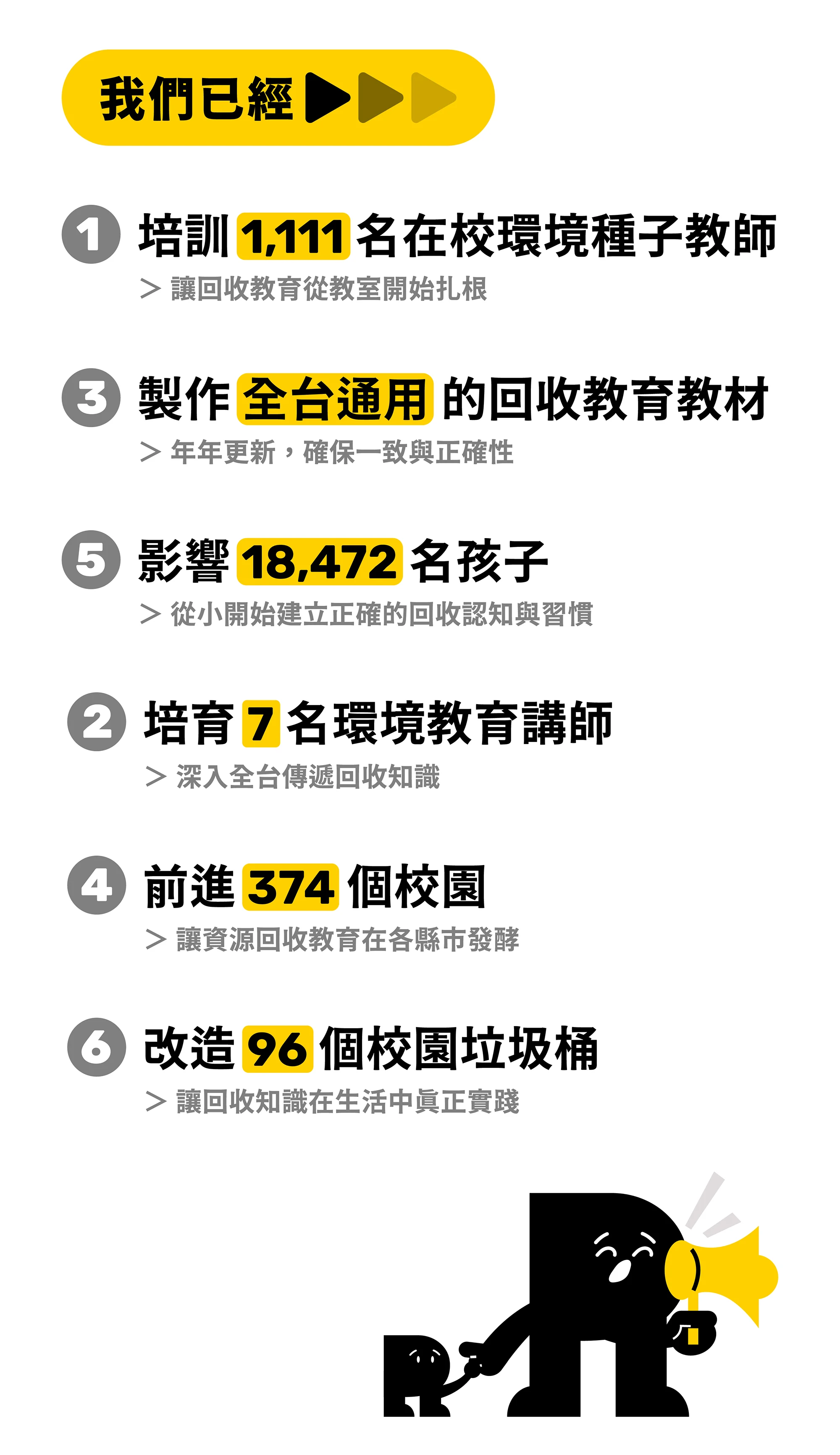 每一份支持,都是推動回收教育的力量。我們從校園出發,擴散到家庭與社會,讓正確的回收知識走進更多人身邊。