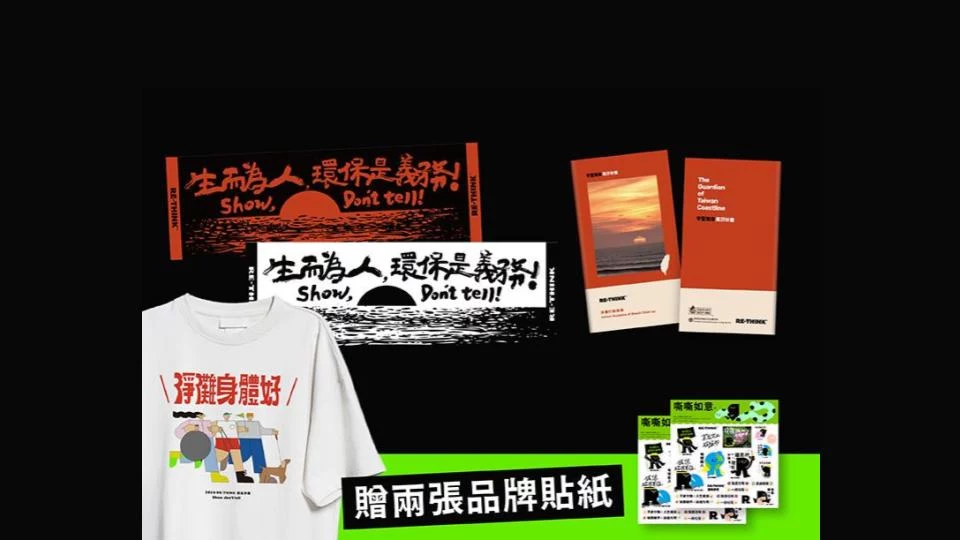 穿上RE-THINK 衣服,掛著「生而為人,環保是義務」毛巾,和我們一起堅持下去。這不只是裝備,更是行動者的識別,一起撿拾每一片塑膠,也擦乾每一滴汗水。