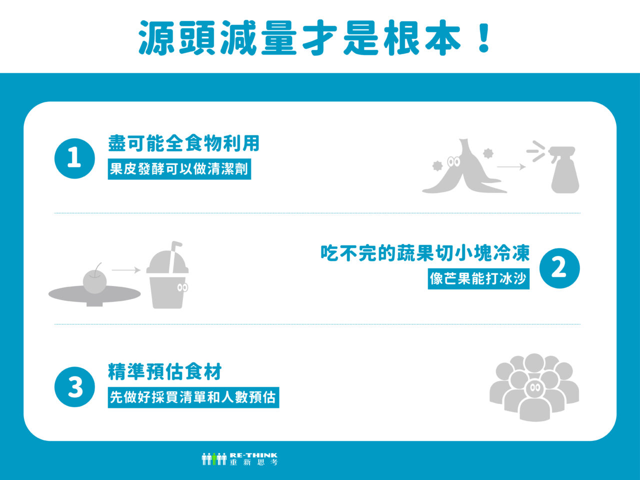 想要降低處理廚餘的麻煩?試著從源頭減量做起,將食材充分使用,將果皮發酵作成清潔劑、吃不完蔬果冰冷凍方便後續料理,或是適量採購等都能避免浪費食物,少一點廚餘就少一點麻煩。